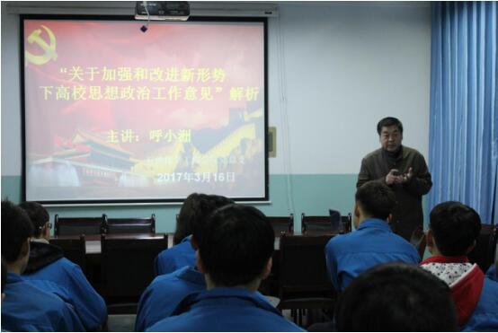 呼小洲就《关于加强和改进新形势下高校思想政治工作的意见》文件精神进行了解读,指出了加强和改进高校思想政治工作的基本原则:坚持党对高校的领导,全面落实从严治党要求;坚持社会主义办学方向,坚持马克思主义指导地位;坚持改革创新,推进理念思路,增强工作的时代感和实效性等,接着对如何做一名优秀党员提出以下观点:要明确入党动机,不忘初心,勇于奉献;树立远大抱负,努力提高自己思想觉悟;坚定立场不动摇,敢于挑战,肯吃苦,积极参加各项活动,在活动中得到锻炼,提升个人能力;开展自我批评,学会自我表扬;坚定信念,淡泊名利,从自己做起,积极发挥党员先锋模范作用,争做文明骨干。