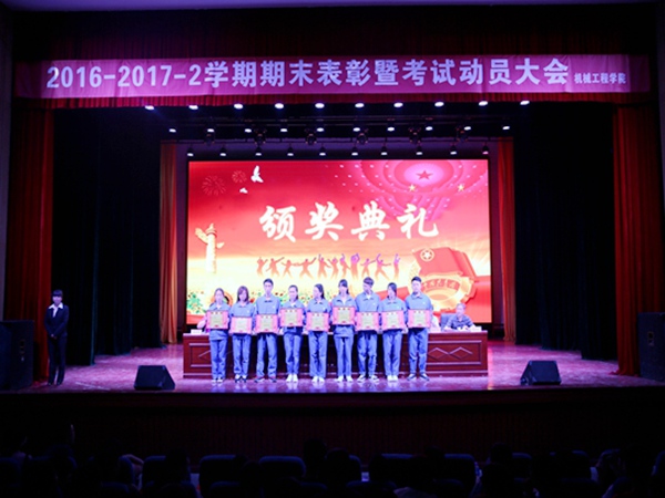 机械工程学院院长赵忠宪宣读“关于机械工程学院2016—2017学年度第二学期学生工作各种竞赛及大型活动先进集体、先进个人的表彰决定”。辅导员宣读了机械工程学院第十七届公寓文化月优秀班级、文明宿舍、先进个人的表彰决定。团总支负责人宣读机械工程学院“十佳之星”表彰决定。院领导为机械工程学院2016-2017-2学期学生工作中涌现出的先进集体及先进个人颁奖。