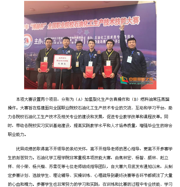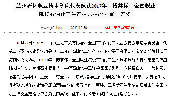 【中国高校之窗】兰州石化职业技术学院代表队获2017年“博赫杯”全国职业院校石油化工生产技术技能大赛一等奖