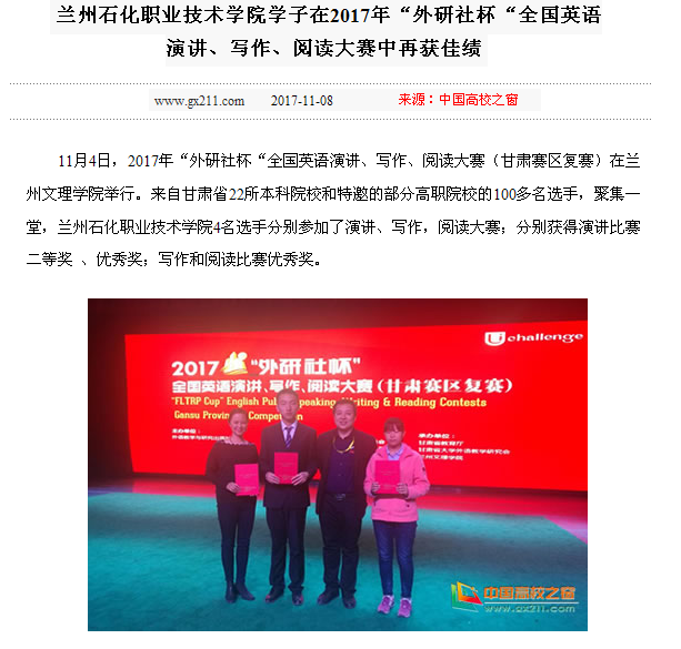 【中国高校之窗】兰州石化职业技术学院学子在2017年“外研社杯“全国英语演讲、写作、阅读大赛中再获佳绩