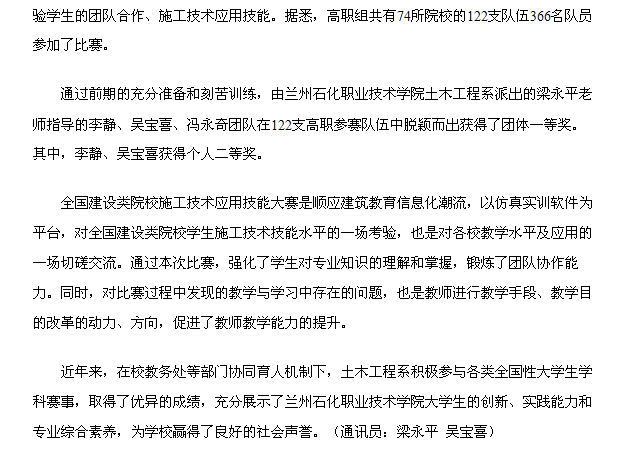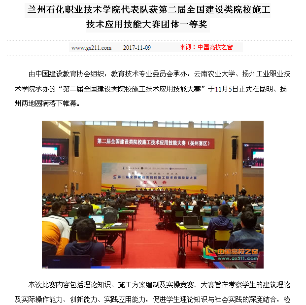 【中国高校之窗】兰州石化职业技术学院代表队获第二届全国建设类院校施工技术应用技能大赛团体一等奖