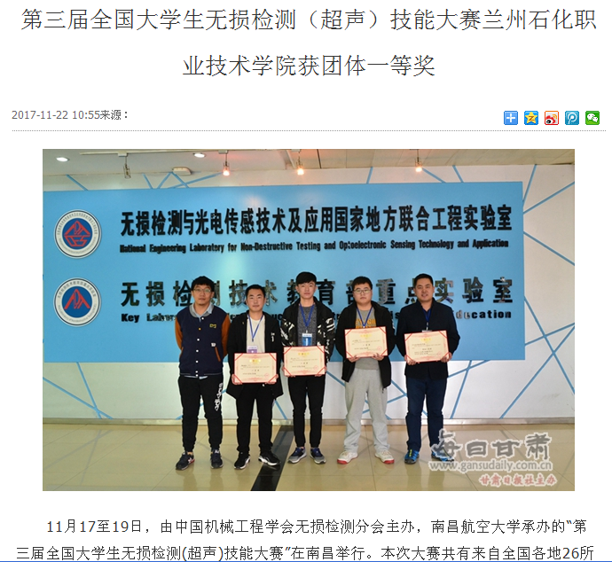 【每日甘肃网】第三届全国大学生无损检测(超声)技能大赛兰州石化职业技术学院获团体一等奖