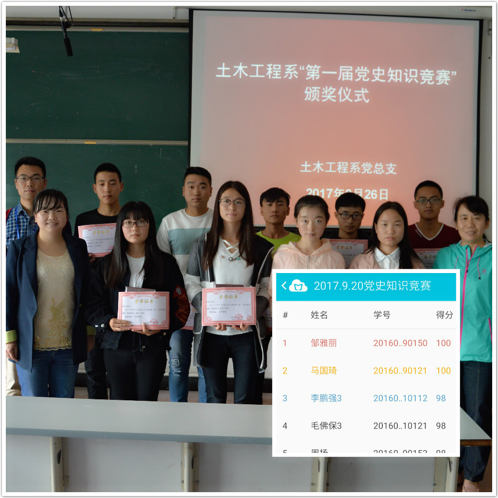 为迎接党的十九大顺利召开,增进广大同学对党史知识的理解与掌握,近日,土木工程系组织学生开展党史知识竞赛。本次竞赛采用现代信息化手段,利用蓝墨云班课软件开展,241名学生参与。