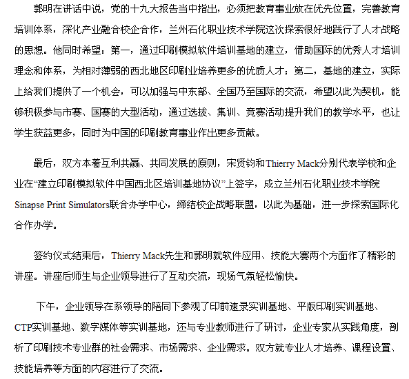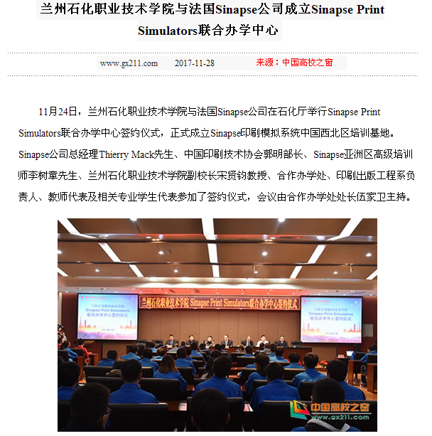【中国高校之窗】兰州石化职业技术学院与法国Sinapse公司成立Sinapse Print Simulators联合办学中心