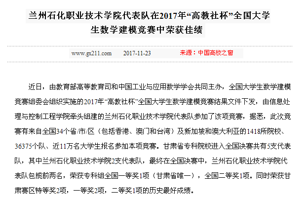 【中国高校之窗】兰州石化职业技术学院代表队在2017年“高教社杯”全国大学生数学建模竞赛中荣获佳绩