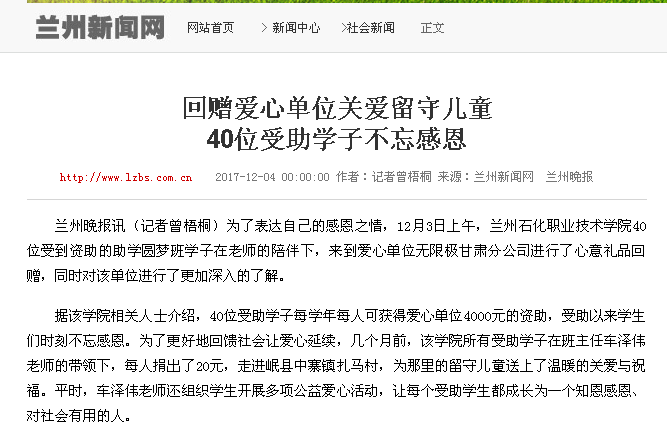 【兰州晚报】回赠爱心单位关爱留守儿童 40位受助学子不忘感恩