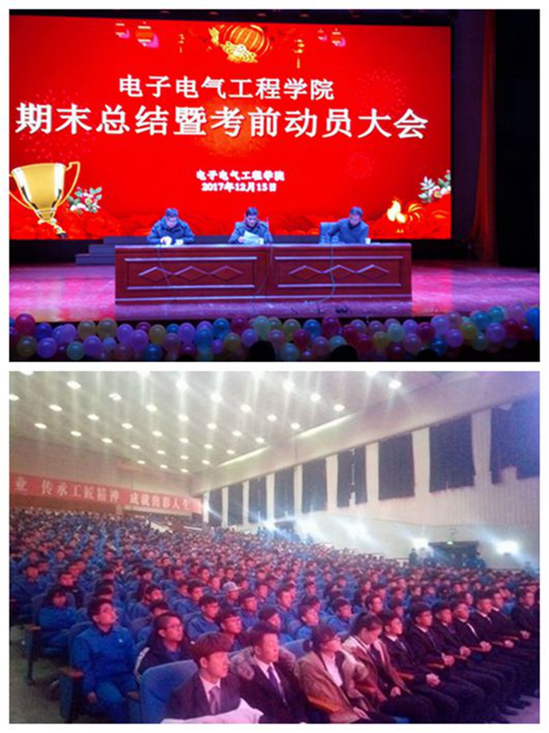 为加强电子电气工程学院学风建设,严肃学院考风考纪,确保学院教学质量,总结上半学期工作,12月15日,电子电气工程学院在东区大礼堂召开期末总结暨考前动员会。电子电气工程学院党总支书记张军、副院长陈宏希、党总支副书记张建军及全院师生1100余人参加会议。