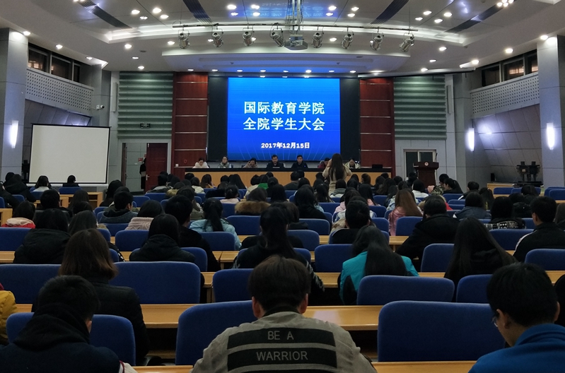 12月15日,国际教育学院在多功能召开本学期全院学生大会暨诚信教育活动,院领导、辅导员、班主任及全院学生参加了活动。