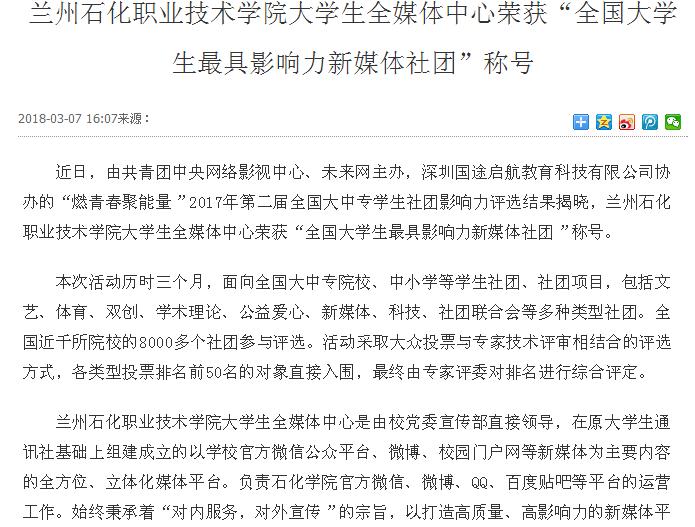 【每日甘肃网】兰州石化职业技术学院大学生全媒体中心荣获“全国大学生最具影响力新媒体社团”称号