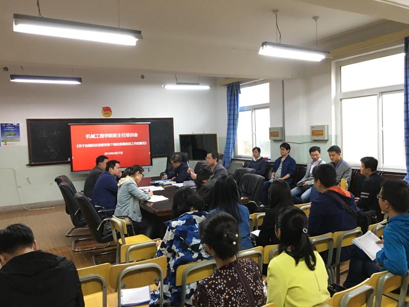 为深入贯彻学习全国高校思想政治工作会议精神,加强和改进新形势下高职院校思想政治工作,切实提高高职院校思想政治工作的质量和水平,4月27日,在机械工程学院会议室举办了以深入学习《关于加强和改进新形势下高校思想政治工作的意见》为主题的班主任培训会。会议由机械工程学院党总支书记魏延宏主持,机械工程学院全体班主任和辅导员参加了会议。