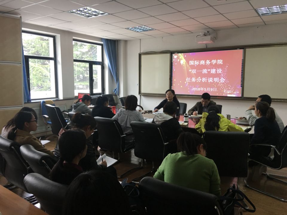 2018年5月9日下午,国际商务学院组织全院教师召开“双一流”骨干专业建设任务说明辅导会。全院23名专职教师全部参加。