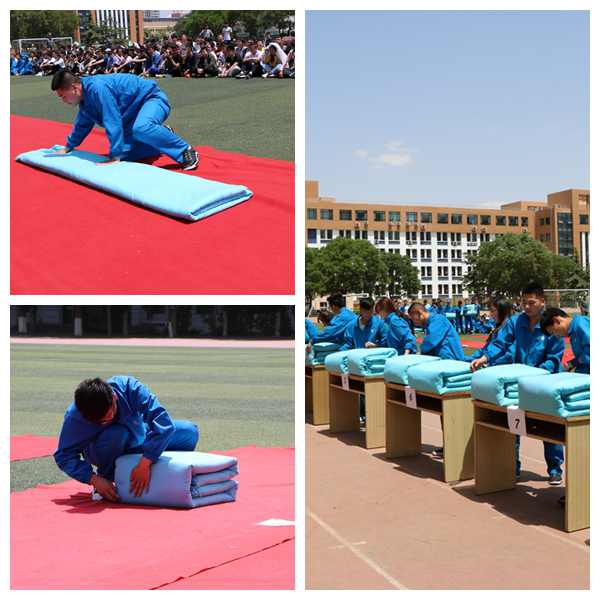 大赛开始,团总支书记赵青山为大赛致开幕词并做动员讲话,紧接着大赛正式拉开帷幕,本次比赛共63名同学报名参加,上场参赛的同学,每组比赛限时5分钟,要求独立完成.根据叠被的时间和质量打分。比赛要求参赛人员在规定的5分钟时间内叠好军被,每组完成后评委给予评比。比赛结束后,统分人员计算各班参赛人员平均成绩,根据得分高低评选出优秀班级及得奖选手,现场气氛热烈,同学们比赛热情高涨,你追我赶,认真仔细,最终一个个标准的军被呈现在我们面前,现场发出阵阵的称赞之声,并发出热烈的掌声,在活动结束之余,学生干部,辅导员老师,即兴展示了自己深厚叠被功底,为同学做出了很好的表率,起到了很好带头作用,同学们纷纷上前参观学习,最终,比赛在颁奖仪式中圆满结束。