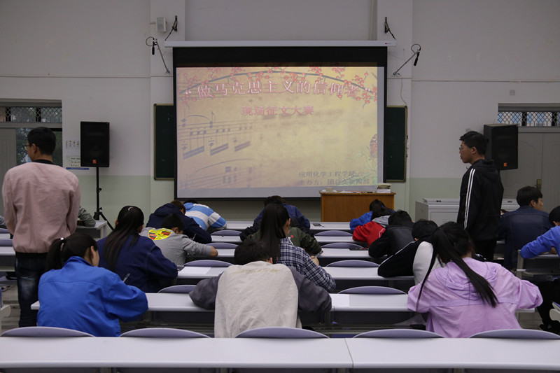 为了进一步检验学习成效,5月23日晚,应化学院团总支新闻部于西阶二教室举办以“做马克思主义的信仰者”为主题的现场写作比赛。参赛人员认真构思文章结构,仔细斟酌用词用句,寄自己真实的所思所想于笔端中,参赛选手们上交了令人满意的答卷。