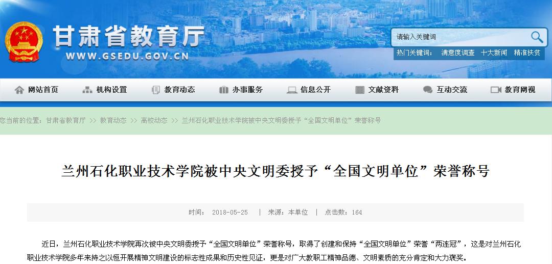【省教育厅】兰州石化职业技术学院被中央文明委授予“全国文明单位”荣誉称号