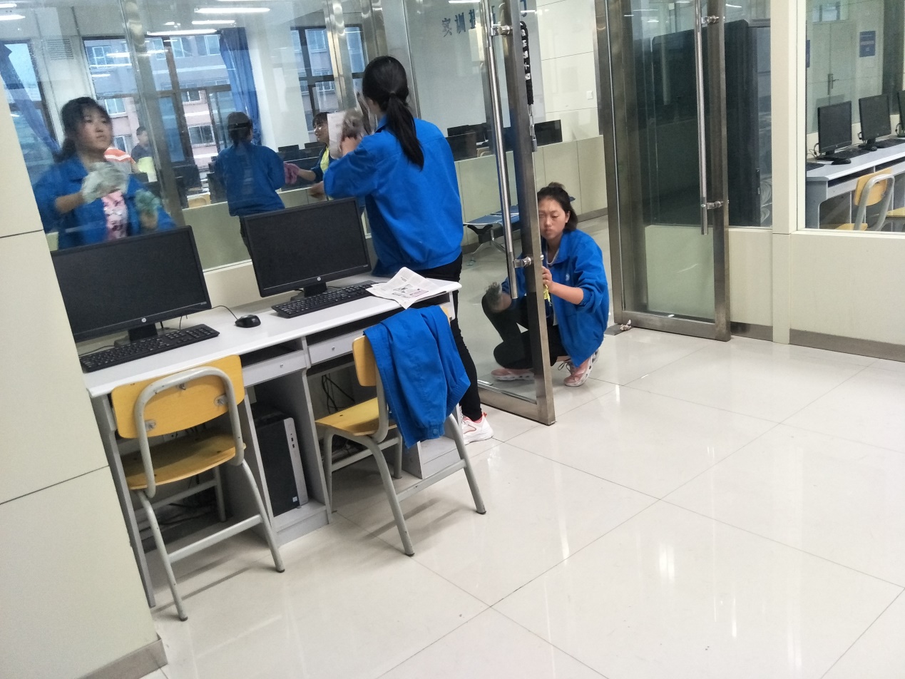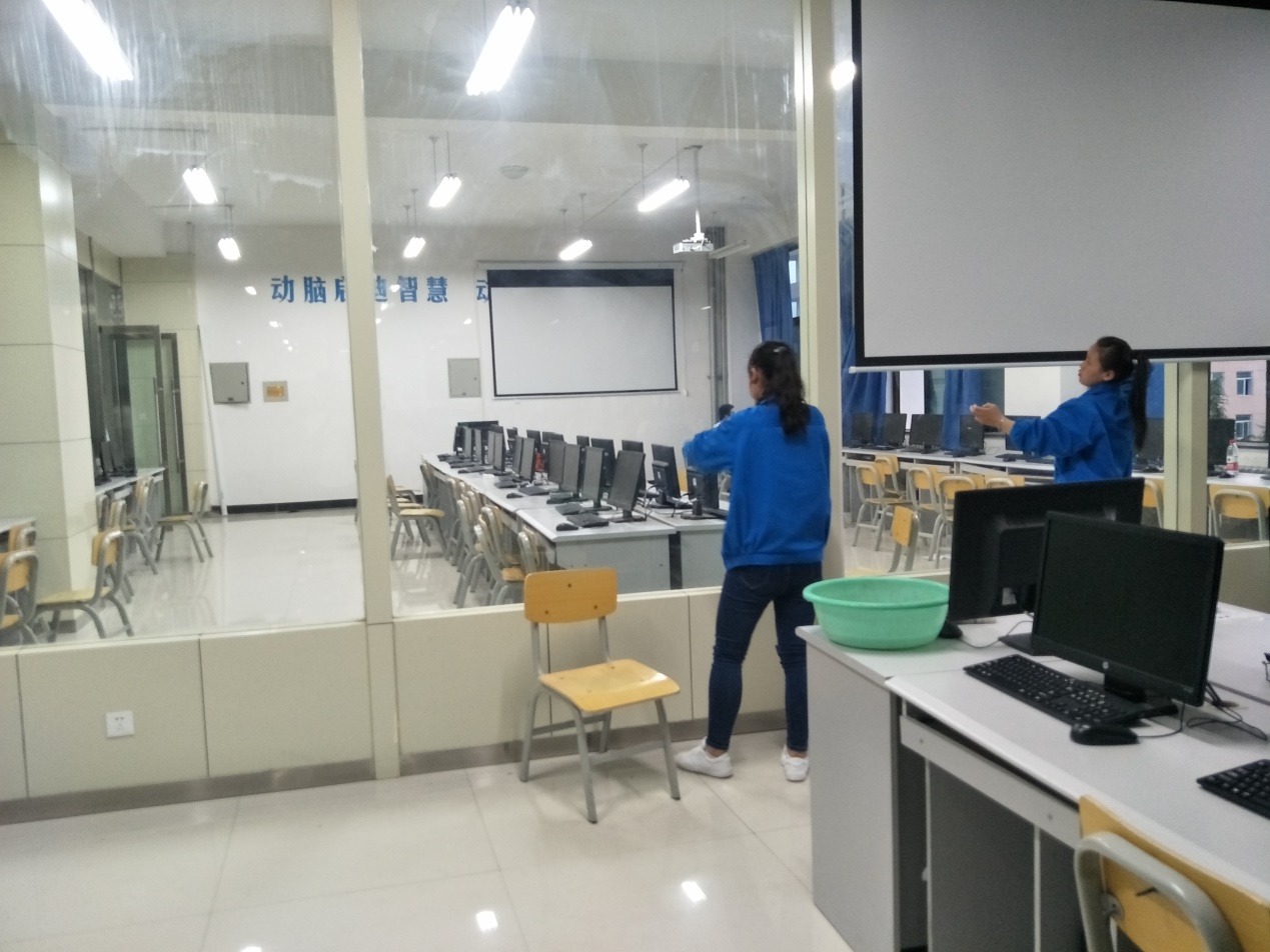 志愿者带着清洁用具来到第四工业中心,团总支负责人将所有志愿者分为擦玻璃、拖地和抹桌子三部分。待到所有工作落实后,同学们便开始分头合作,投入到自己的工作中。同学们不怕脏累,卷起裤脚,卖力干活。拖地抹窗,有条不紊。因为志愿者人数较多且相互配合,清洁工作进展得很快。