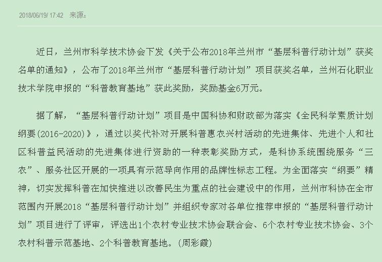 【每日甘肃网】兰州石化职业技术学院获2018年兰州市“基层科普行动计划”奖励
