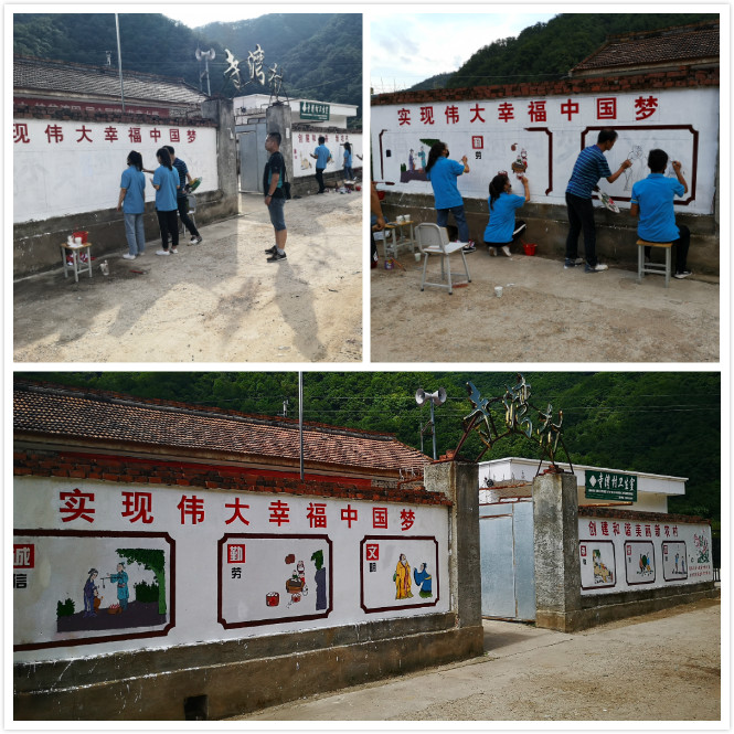8月12日至19日,志愿分队抽出部分艺术设计专业队员,分工协作,加班加点,在对村委会院内外墙体进行打磨、粉刷、防水处理及绘制素材后,开始了“实现伟大幸福中国梦 创建和谐美丽新农村”为主题的墙绘工作。