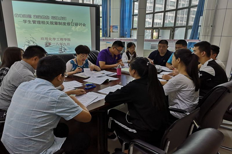 为进一步加强分院学生管理工作,促进优良班风、学风建设,增强学生管理工作针对性、实效性。9月2日上午,应用化学工程学院在四中心二楼会议室召开“找准问题、定实措施、增强成效”学生管理相关规章制度修订专题研讨会,会议由学院党总支书记吴海霞主持,应用化学工程学院辅导员、班主任、部分班团干部参加了研讨会。