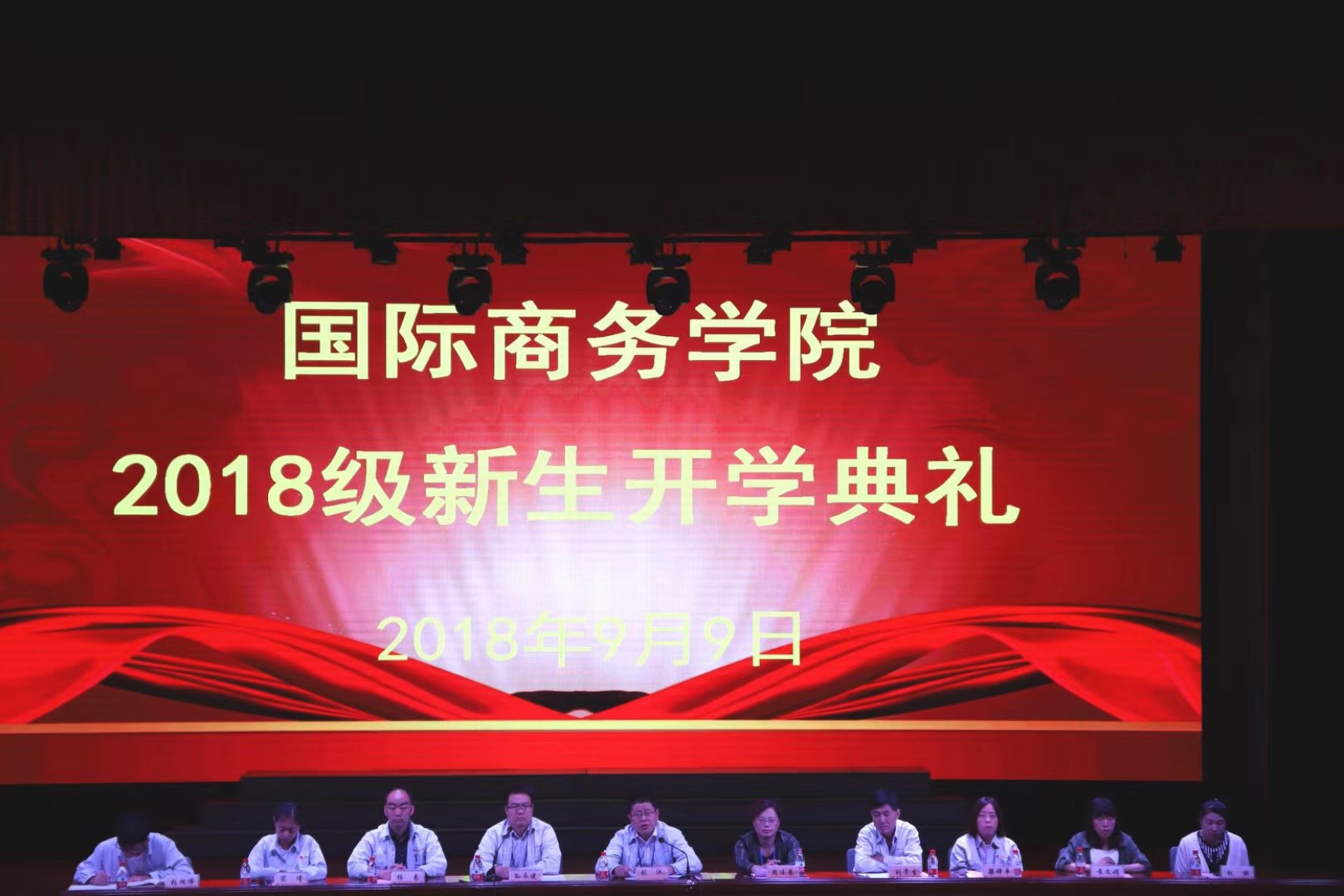 金秋九月,丹桂飘香。9月9日上午,国际商务学院2018级新生开学典礼在东区礼堂举办。国际商务学院院长周任慧、党总支书记刘江、副院长刘贵生、院办副主任孙永建,院办全体人员,各教研室主任,新生班主任以及2018级446名新生参加典礼。仪式由孙永建主持。