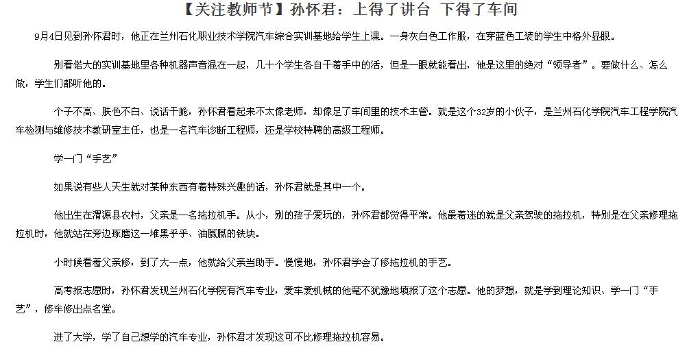 正在准备就业之际,他得知兰州石化学院需要一个汽车综合实训基地的管理人员,孙怀君对这个基地充满感情,就回来应聘,又从学生变成了学校的工作人员。