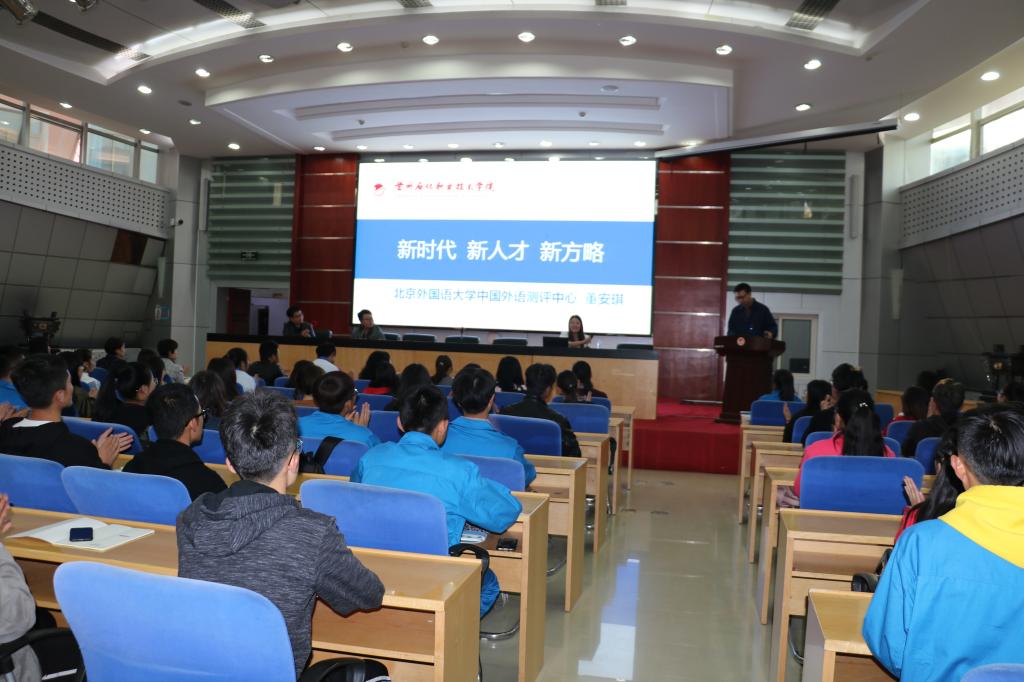 职通精彩未来,智通美好人生。为培养学生核心素养和英语沟通能力,提高就业核心竞争力,开拓师生的国际视野,10月16日下午,国际教育学院特邀北京外国语大学中国外语测评中心董安琪老师做讲座,讲座由国际教育学院院长王鹏主持,国际教学学院全体教师及来自各个院系对国才考试感兴趣的学生聆听了讲座。