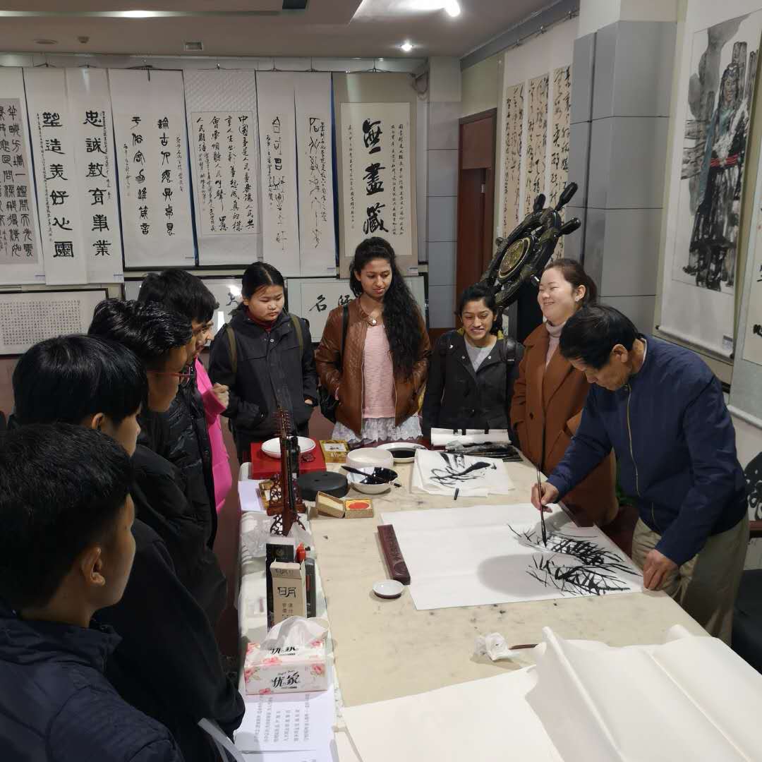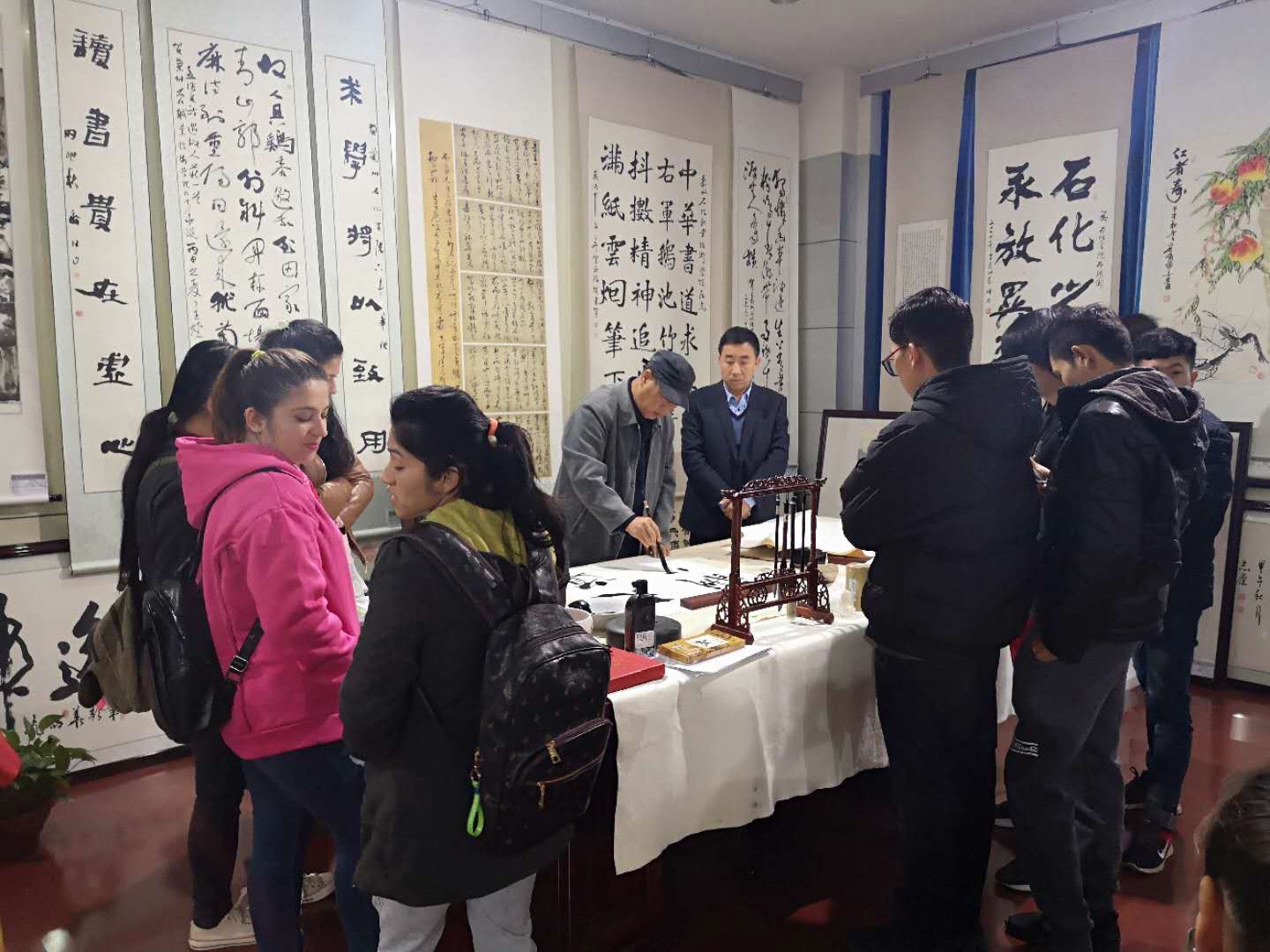 10月31日上午,2018级留学生到图书馆书画室上了中国传统文化的第一课——欣赏、学习了解了中国书法和国画,并学习了中国书法和国画技法。在学习过程中,国际教育学院党总支副书记赵常学为留学生讲解了中国书法的相关知识,带领留学生参观了书画展,特邀书画家冯廷文、张玉润老师对书法技法、国画技法进行了现场展示,并为每一个留学生都赠送了一幅书法或国画作品。留学们深切感受到了优秀中国传统文化的书法和绘画的魅力,受益匪浅,希望在以后的学习中能够进一步提高。