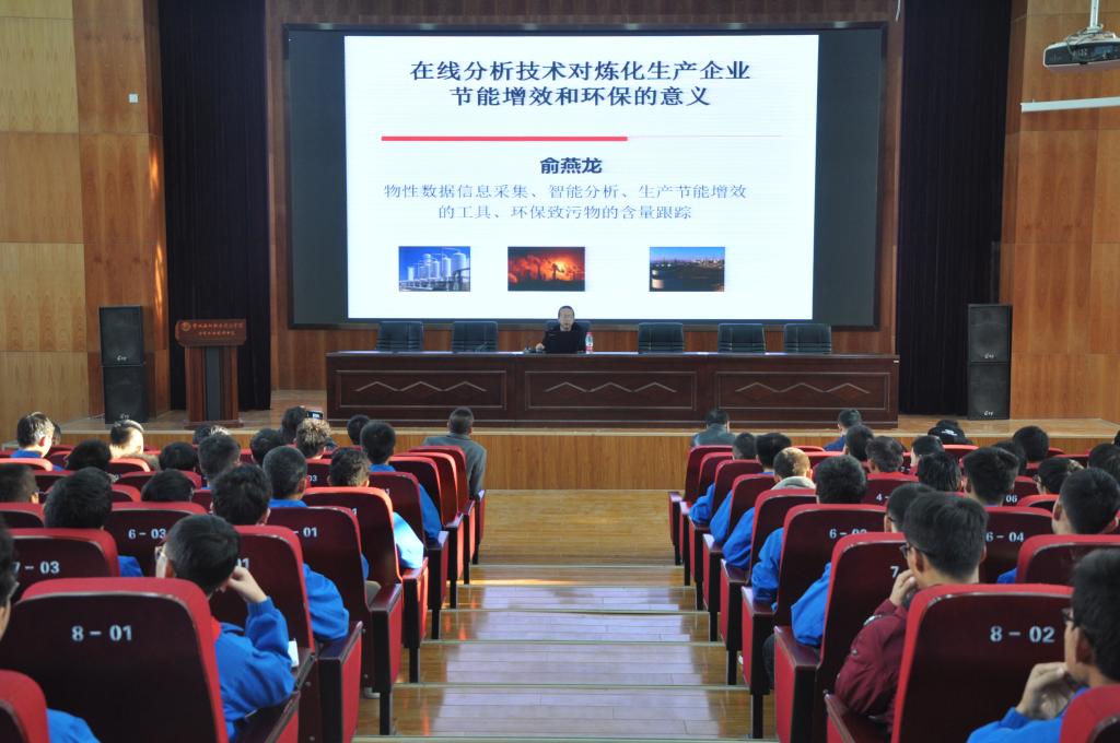 讲座开始,焦宏林对俞燕龙做了简单的介绍。随后俞燕龙根据现在社会科技的发展为我们介绍了四种在线分析技术:在线核磁分析技术、在线近红外分析技术、在线激光分析技术、在线硫氯分析技术。在简单给学生们介绍了基本的分析方法与仪器之后,还告诉了学生们对于不同材料的分析适用于那种分析技术。接着俞燕龙介绍了NMRA在线分析系统应用装置,以及一些其他常用仪器,告诉了学生们仪器的基本原理以及使用方法。紧接着俞燕龙介绍了一些原油调合方法以及其经济前景,告诉了学生们仪器的重要性以及国内分析仪器与国外仪器的差距。最后焦宏林老师对此次讲座做了总结,阐述了在线质量仪表在炼油化工行业的重要性以及同学们广阔的就业前景,并感谢俞燕龙副的精彩讲座。