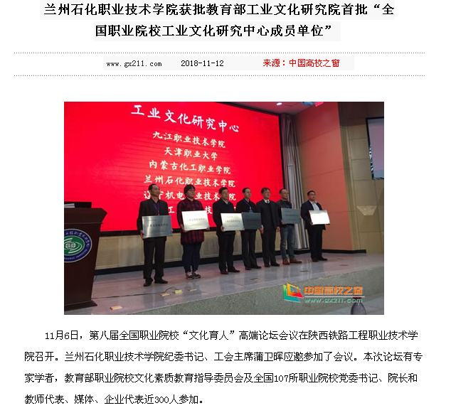 【中国高校之窗】兰州石化职业技术学院获批教育部工业文化研究院首批“全国职业院校工业文化研究中心成员单位”