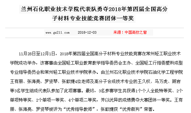 【中国高校之窗】兰州石化职业技术学院代表队勇夺2018年第四届全国高分子材料专业技能竞赛团体一等奖