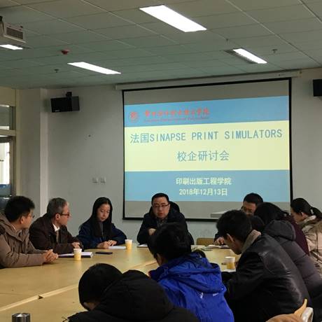 12月13日,印刷出版工程学院与Sinapse公司在印刷工艺实训室召开校企研讨会,Sinapse公司总经理Thierry Mack先生、Sinapse亚洲区高级培训师李树章先生、合作办学处副处长陈蕾、印刷出版工程学院负责人、印刷媒体技术教研室全体教师参加了本次会议。