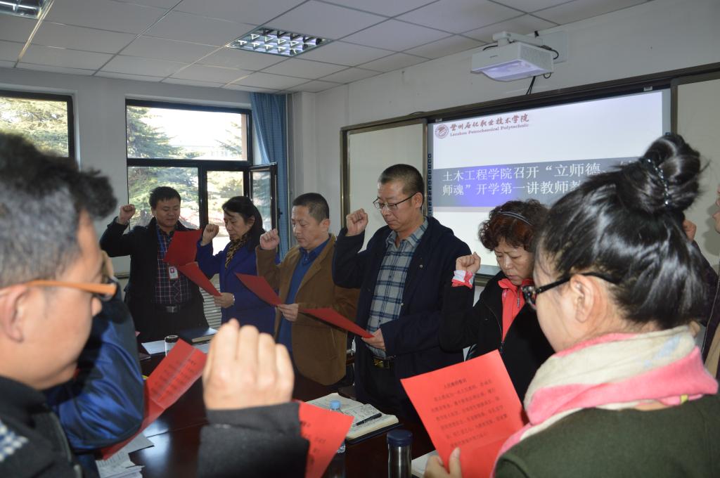 土木工程学院院长袁维红介绍了《国家职业教育改革实施方案》即职教20条颁布的背景、意义、总体要求与目标,逐条详细介绍了完善国家职业教育体系、构建职业教育国家标准、促进产教融合校企“双元”育人等七大方面共20条实施细则。袁维红学校刚刚召开的本学期第一次教学工作例会精神,联系土木工程学院实际情况,重点解读了深化复合型技术技能人才培养培训模式改革,借鉴国际职业教育培训普遍做法,制订工作方案和具体管理办法,启动1+X证书制度试点工作的内容,要求各教研室积极探索本专业的1+X证书工作。最后,全体教师集体进行人名教师宣誓。