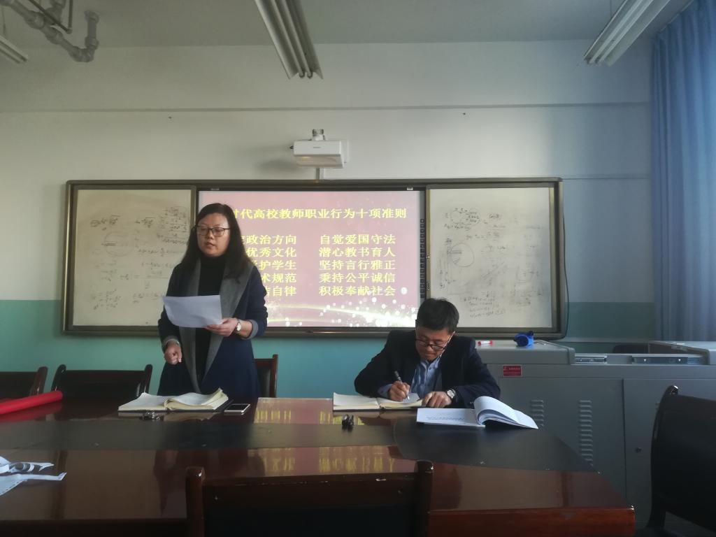 会上,石油化学工程学院院长李薇按照教育部、省教育厅和学校相关文件精神的要求,带领大家共同学习了《新时代高校教师职业行为准则》、《教育部关于高校教师师德失范行为处理的指导意见》等。随后组织教师进行了庄严的宣誓,并在横幅上进行了签字。