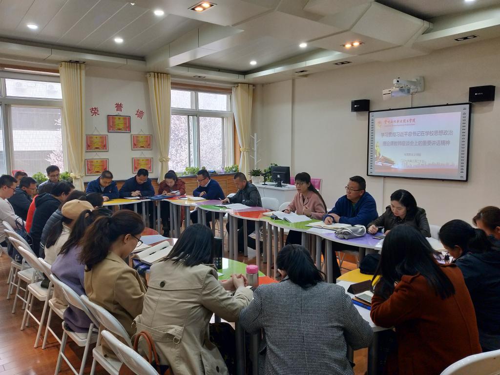 会上,马克思主义学院党总支书记江秀华带领大家深入学习和领会了习近平总书记在学校思想政治理论课教师座谈会上的重要讲话精神。她指出此次讲话,在中国共产党执政以来的历史上是第一次,这充分体现以习近平同志为核心的党中央,对思想政治理论课的高度重视和对思想政治理论课教师的殷切期望,作为新时代的思政课教师要深入学习和深刻领会本次讲话的精神实质,并自觉以“六个要”和“八个统一”为基本遵循,在提升理论素养和改进思政课教学方法上不断开拓创新,以高度使命感和责任感担负起为中华民族伟大复兴培养时代新人历史重任。