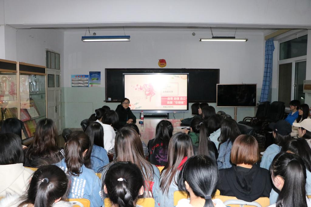 为了加强大学女性同学们的日常管理,增强女性同学们的安全防范意识,学会积极主动、阳光、自信的面对大学生活,3月22日晚,机械工程学院在机电楼展览室举行了以“自尊、自强、自立、自爱”为主题的专题讲座。办公室副主任王小芬主讲。