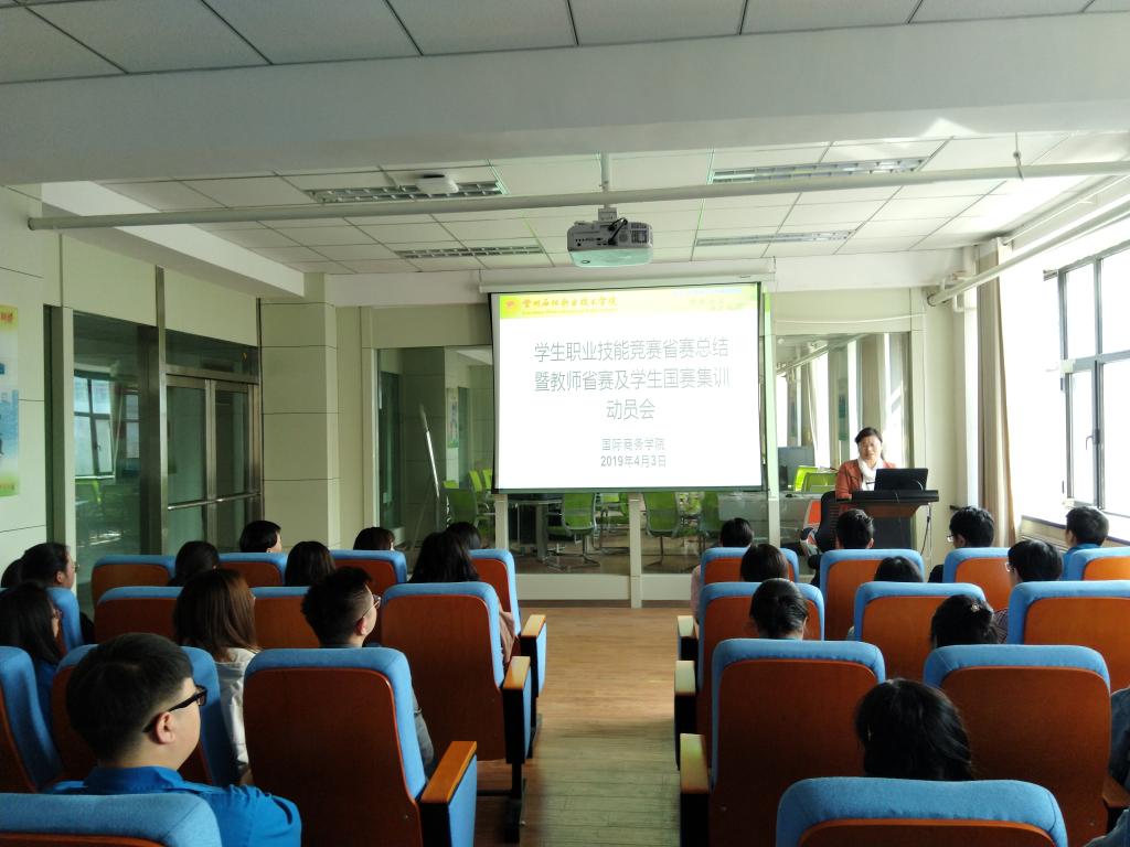 为了更好地迎接2019年全国职业院校技能大赛,做好赛前集训工作,4月3日上午,国际商务学院在东主教五楼路演室举办2019年学生技能竞赛总结暨教师技能竞赛及学生国赛集训动员会。学院领导班子成员,各赛项指导教师、参赛教师、参赛学生等30余人参加了会议,会议由国际商务学院副院长刘贵生主持。