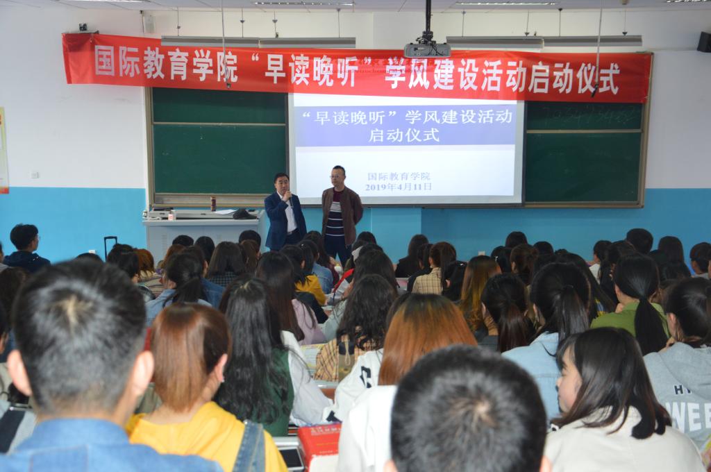 “早读晚听”英语学习活动是国际教育学院院长期以来开展的特色学风建设活动,收到了良好的效果,为进一步促进我校学风建设,提高学生的英语应用能力、听说能力,近期,在校生中强化开展 “早读晚听”英语学习特色活动,把该活动打造为“老字号”特色活动和品牌,为此,国际教育学院于4月11日在东区阶梯教室开展了“早读晚听”学风建设活动启动仪式,国际教育学院院负责人、辅导员、班主任及全体在校生参与,“黄河英语”创始人袁文老师应邀参加了此次活动。