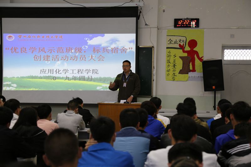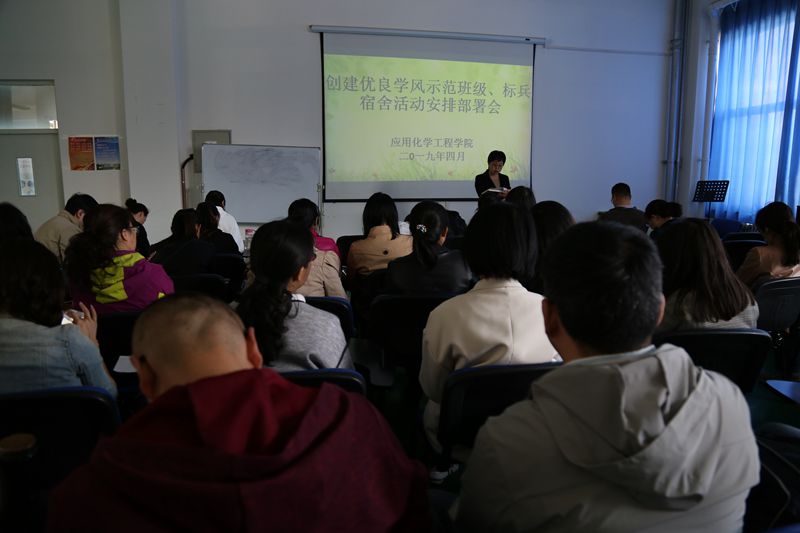 为积极落实学校创建优良学风示范班级、标兵宿舍活动实施方案的通知要求,应用化学工程学院经过多次商议调研,制定了《应用化学工程学院创建优良学风示范班级、标兵宿舍活动实施方案》,近期,分别在第四工业中心会议室召开教职工大会、西阶二教室班团干部(党员)大会、各班级晚自习教室主题班会、西区操场全体学生大会等集中教育动员活动,层层发动,步步落实,拉开学院创建优良学风示范班级、标兵宿舍活动的序幕。