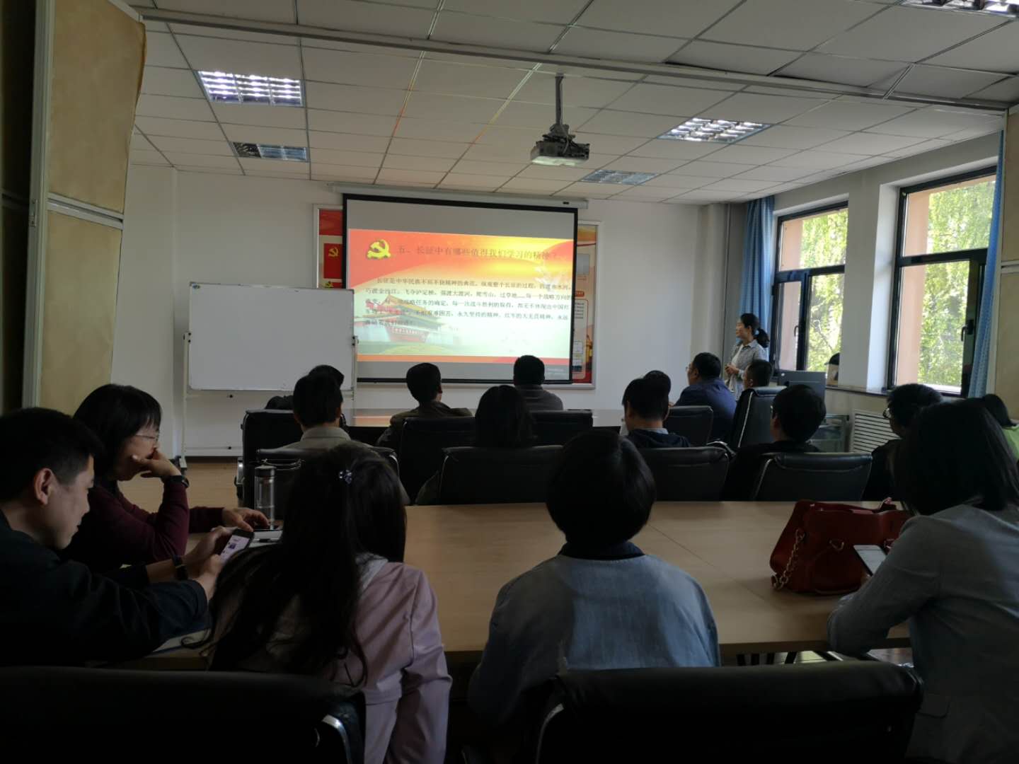 4月18日下午,机械工程学院教工党支部在东区主教楼党员活动室举行“弘扬伟大长征精神 走好新时代长征路”主题党课,本次党课由支部书记张胜男主讲,支部全体党员参加了本次党课学习。