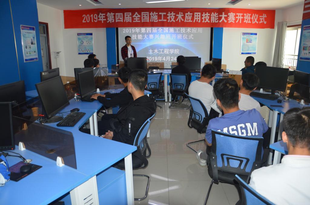 4月24日中午,土木工程学院在BIM实训室举办第四届全国建设类院校施工技术应用技能大赛兴趣班开班仪式,经过初步选拔的30名同学参加本次活动。本次活动由苟卫强老师主持。