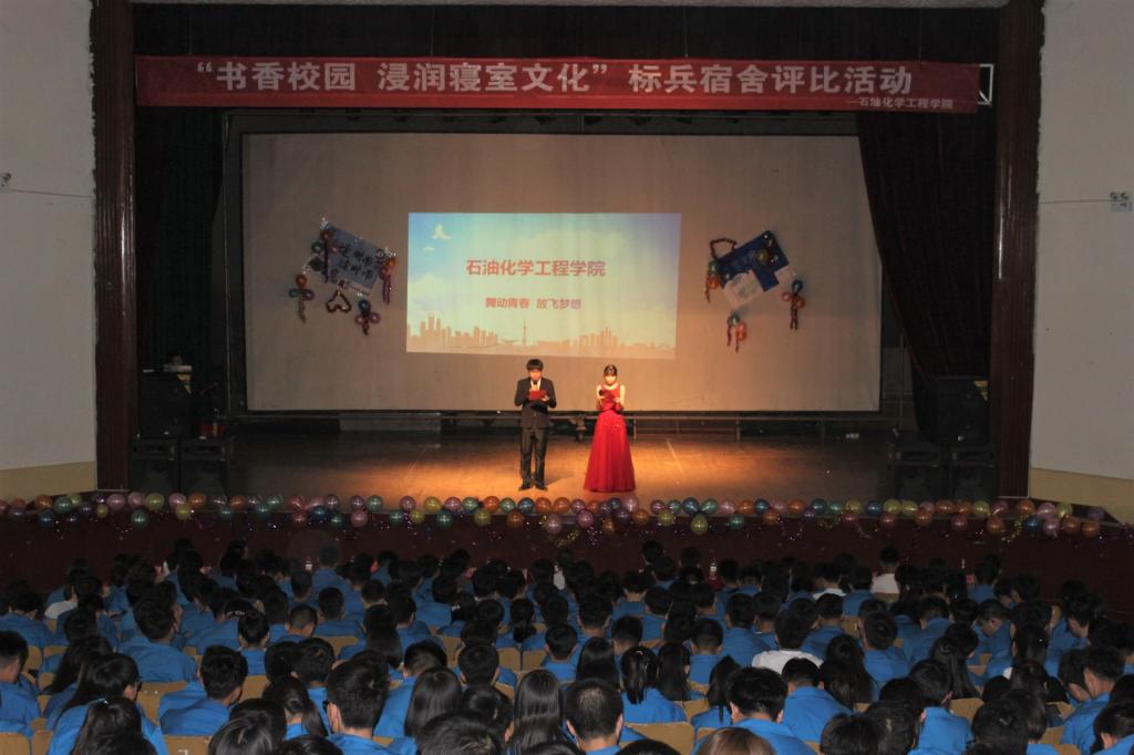 4月26日在西区礼堂举办了“书香校园,浸润寝室”标兵宿舍评比活动,举办“书香校园,浸润寝室文化”标兵宿舍评比晚会,活动伴随着主持人的报幕结束,各个标兵宿舍依次上台表演准备的才艺,选手们用自己的方式表达着对这次活动的重视性,表演的形式有跳舞,唱歌等,给观众们带来了一场绝妙的视听盛宴,台下时而爆发出热烈的掌声,全场气氛非常热烈。工分185班208宿舍和石化182班207宿舍分别带来的歌曲更将本次比赛推向高潮,共同摘夺了本次比赛的桂冠。李胜泥对本次活动进行了总结,他强调,“宿舍是我们的家,弘扬宿舍文化就是展现学生自身的文化素养”。最后伴随着学生们热烈的掌声,本次标兵宿舍评比活动圆满结束。