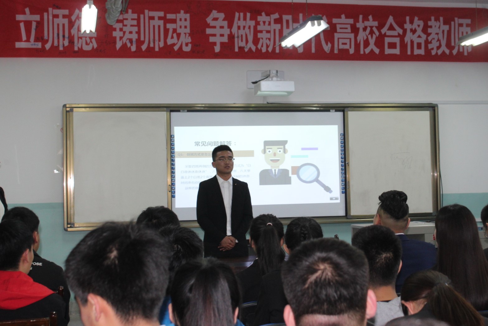 会上,刘拥军首先通过PPT的形式向学生们详细介绍了该企业的地理位置、企业文化和企业的发展前景。接着,刘拥军向学生们重点讲解了该企业在薪资待遇、社保福利、五险一金、晋升机制等一系列关乎学生们切身利益方面的规章制度。在会议中,在该公司就职的14级学长蒙晖还讲述了他在该公司的工作经验和生活经验,这让学生们更深刻更真实的了解了该公司的情况。最后,刘拥军又与学生们进行了简单的交流,帮助学生们更好的了解该公司。