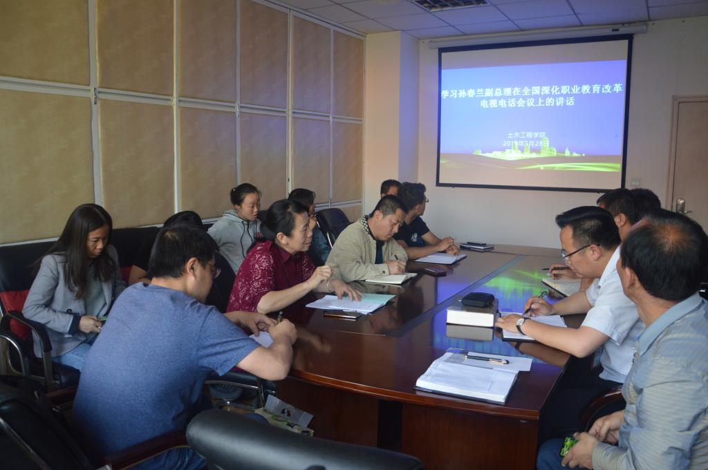 5月28日,土木工程学院召开学习副总理孙春兰在全国深化职业教育改革电视电话会上的讲话会议,会议由党总支书记主持,土木工程学院全体教师参加了会议。