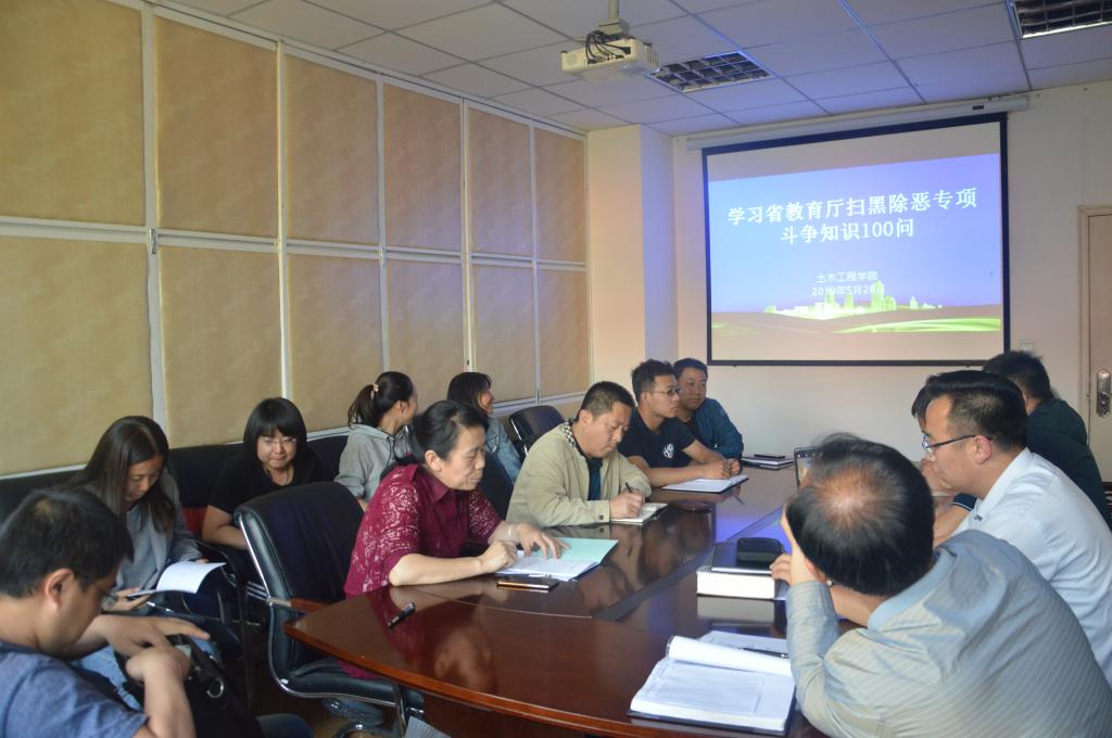 5月28日,土木工程学院组织全体教职工学习扫黑除恶专项斗争知识100问。今年是扫黑除恶专项斗争第二年,按照总体安排部署,是深挖根治的关键之年,按照习近平总书记关于扫黑除恶专项斗争重要讲话和指示批示,应将扫黑除恶专项斗争的部署要求纳入到党支部理论学习中心组学习内容,纳入到日常教育学习内容,认真组织学习,深刻领会扫黑除恶的重大意义,从思想上、行动上坚决与党中央保持高度一致。