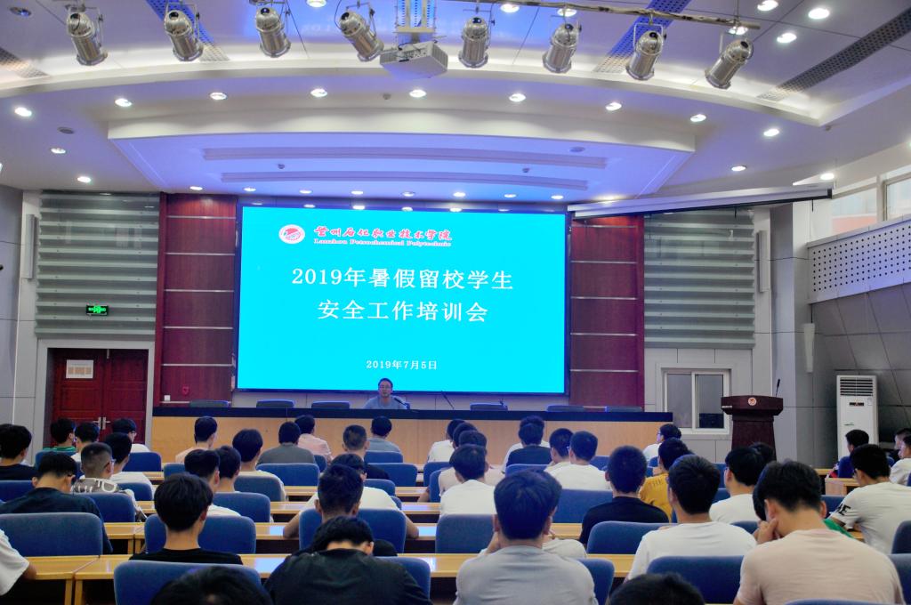 7月5日,学校在东区多功能报告厅召开2019年暑假留校学生安全工作培训会议,各二级学院留校值班及技能大赛培训学生共200余人参加了培训。