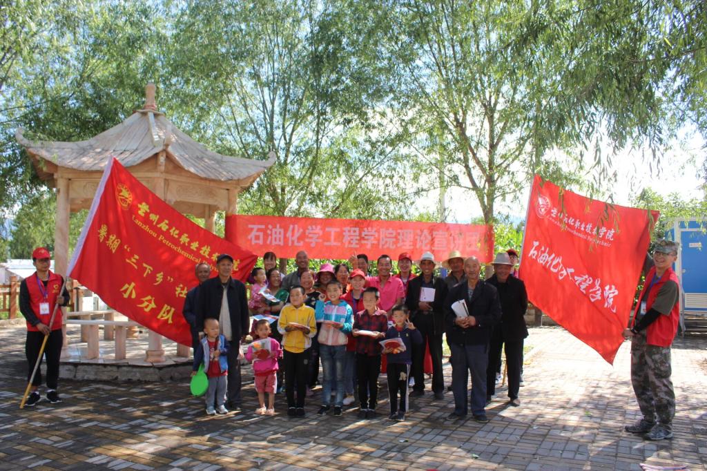 为深入学习贯彻习近平新时代中国特色社会主义思想和党的十九大精神,引导我院学生积极投身全面建成小康社会伟大实践,在实践活动中深刻感受新中国成立70周年所取得的伟大成就以及深刻领会习近平总书记在纪念五四运动100周年大会上的重要讲话精神,为新农村建设做好广泛宣传,并在实践中成长为有理想、有本领、有担当的新时代青年。2019年7月8日至7月12日,石油化学工程学院积极响应学校号召,成立“石油化学工程学院理论普及宣讲团”,组织师生赴兰州市榆中县龚家屲村组织开展了以“青春心向党建功新时代”为主题的暑期三下乡社会实践活动。本次活动由石油化学工程学院赵立祥、席满意、李胜泥和马克思主义学院叶婷四位老师带领7名优秀同学组成三下乡小分队,活动重点围绕习近平新时代中国特色社会主义思想和党的十九大精神,开展宣讲报告、学习座谈、调查研究、政策宣传、视频播放等形式多样的社会实践活动。