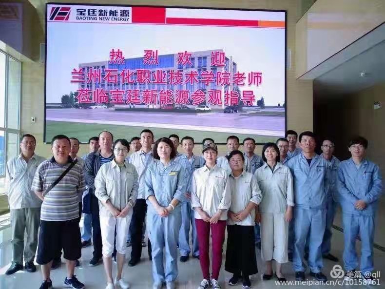 在宁夏宝廷新能源有限公司,老师们受到了公司总经理、人资部长及各车间主任的热情接待。人资部罗部长带领老师们参观了公司质检部、中控室、销售部、生产现场等,随谈中,她说,公司当前处于筹建期,预计10月底开工,此次从兰州石化学院新引进的学生,每天都在现场摸流程、爬管线、学设备,很是用功,他们都将作为此次开工的主力军,开车成功后,他们也就是该装置的元老了。座谈中,公司总经理对老师们的到来表示欢迎,他就公司发展现状、公司主营业务、公司预期规划等向老师们进行了详细的讲述。随后质量管理部长辛智龙、车间主任李浩德等作为我校优秀校友进行了各自管辖工作的介绍;新进厂员工柴振伟也表示,不辜负学校的培养和老师的教导,静下心来、鼓足干劲、立足岗位、踏踏实实的把工作干好,为母校争光、为自己争气。接着,冷宝林老师向公司领导表明了此行的目的,也对我校学生提了个人期望,他说,希望我校毕业生牢固树立终身学习的理念,切实将理论联系实践落到实处。会后,老师们深入企业各个装置进行交流学习。
