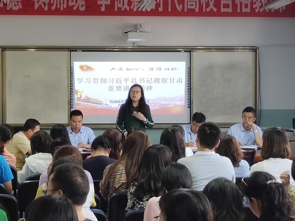 石油化学工程学院院长结合“不忘初心、牢记使命”主题教育,贯彻落实党中央关于加强师德师风建设的部署,深入学习习近平总书记视察甘肃重要讲话精神,总结近年来学院教学工作取得的新进展新成效,鼓励广大教师和教育工作者不忘初心、牢记使命,积极争做“四有”好教师。