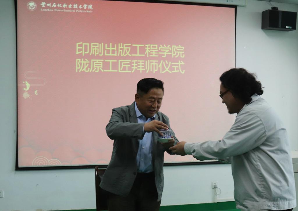 9月19日下午,印刷出版工程学院在第三工业中心印刷工艺实训室隆重举办了陇原工匠拜师仪式暨敦煌彩塑非物质文化传承座谈会,我校刘剑云、丑岩桦两位教师拜陇原工匠、敦煌彩塑非物质文化传承人杜永卫教授为师,建立了师徒关系。