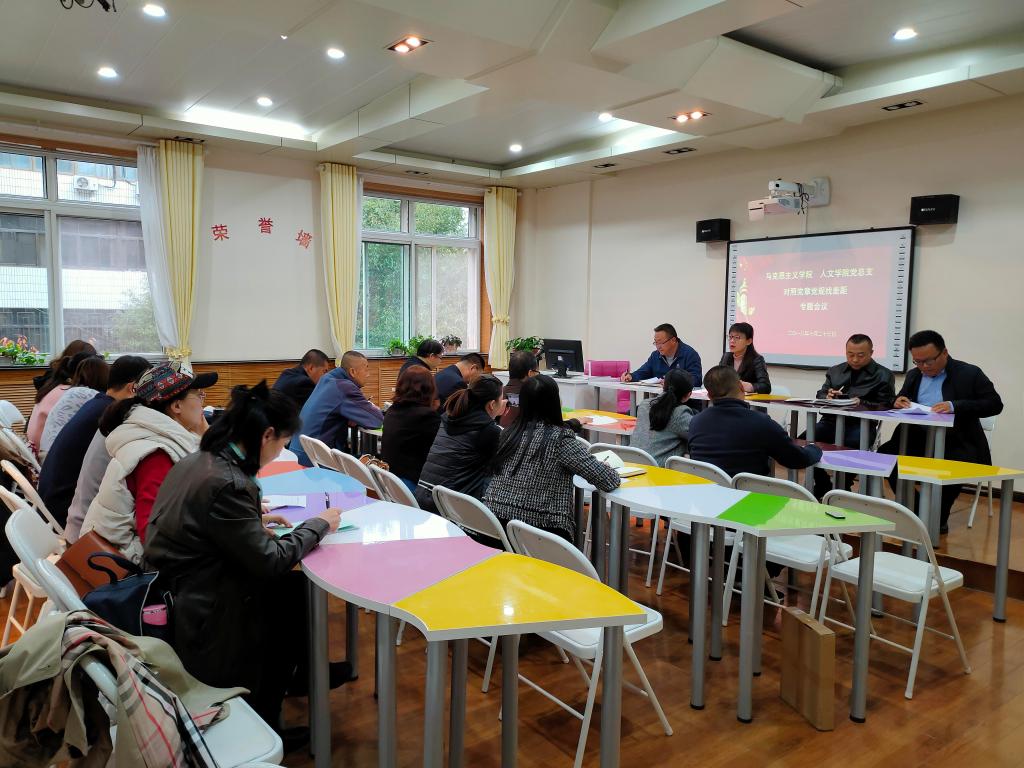 10月24日,马克思主义学院、人文学院党总支在体育馆二楼会议室召开领导班子成员对照党章党规找差距专题会议,党总支书记江秀华主持会议,马克思主义学院、人文学院领导班子和全体党员参加会议。