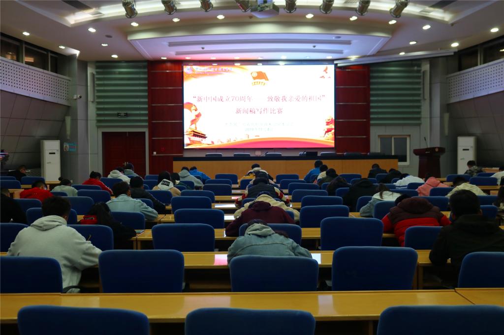 11月12日晚,校团委在东区报告厅举办“新中国成立70周年——致敬我亲爱的祖国”新闻稿写作比赛,团委老师及来自10个学院的100余名选手参加了比赛。